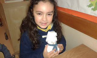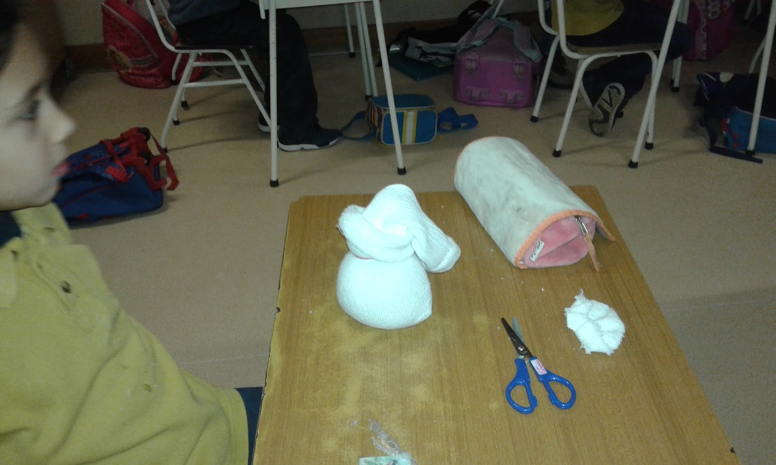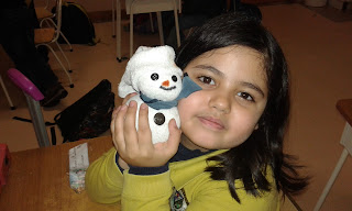 Hoje, a professora Susana, a mãe do Tomás, foi-nos ensinar como se confeciona um lindo boneco de neve, com meias e areia...
